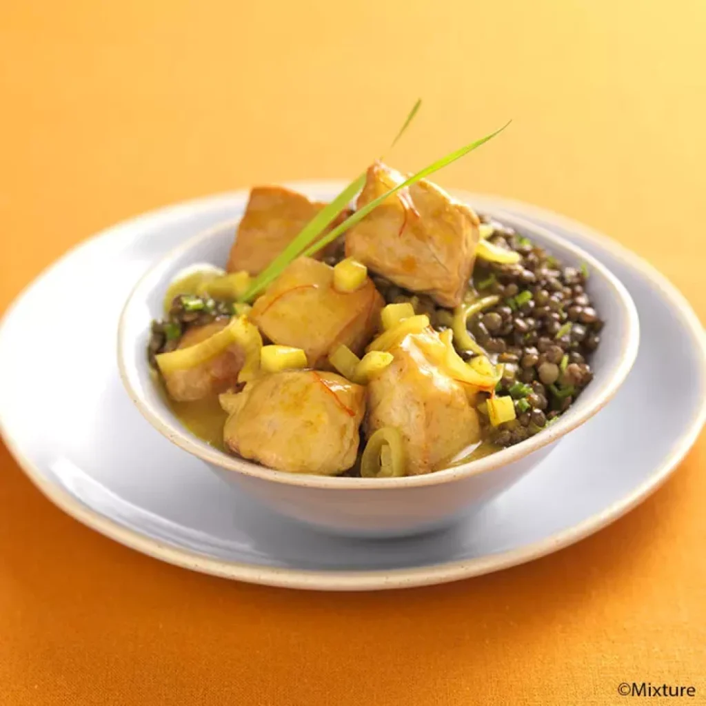 Curry de rouelle de porc épicé et lentilles vertes