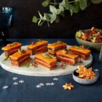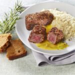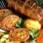 Servir le boeuf bourguignon aux fruits secs nappé de sauce, saupoudré de noix et accompagné d’une purée de pomme de terre.